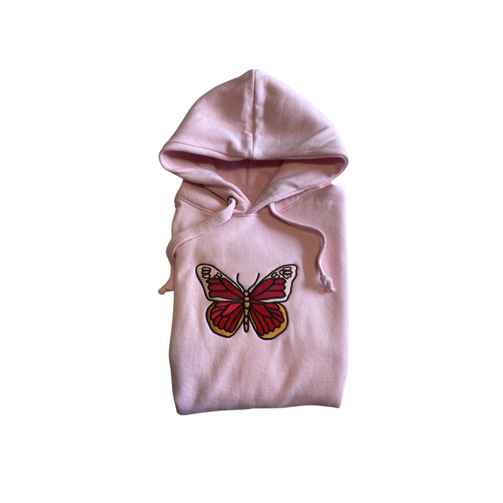 Premium pastel pink butterfly hoodie, with sample version of our butterfly logo
